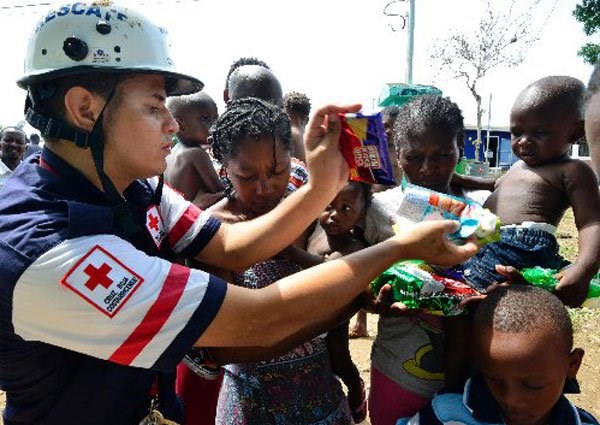 A Costa Rican Red Cross member distributes food to migrants in an encampment of Africans in Penas Blancas, Guanacaste, Costa Rica, in the border with Nicaragua on July 19, 2016. PHOTO | AFP