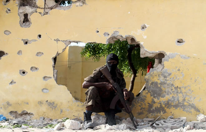 A Somali soldier takes position at the scene of a suicide attack by al Shabaab militants in capital Mogadishu on 21 June 2015. REUTERS/Feisal Omar