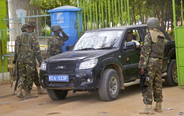 FILE - Kenya Defence Forces (KDF) guard the main gate of the Garissa University College compound that was the scene of a recent attack by al-Shabab gunmen, in Garissa, April 6, 2015.
