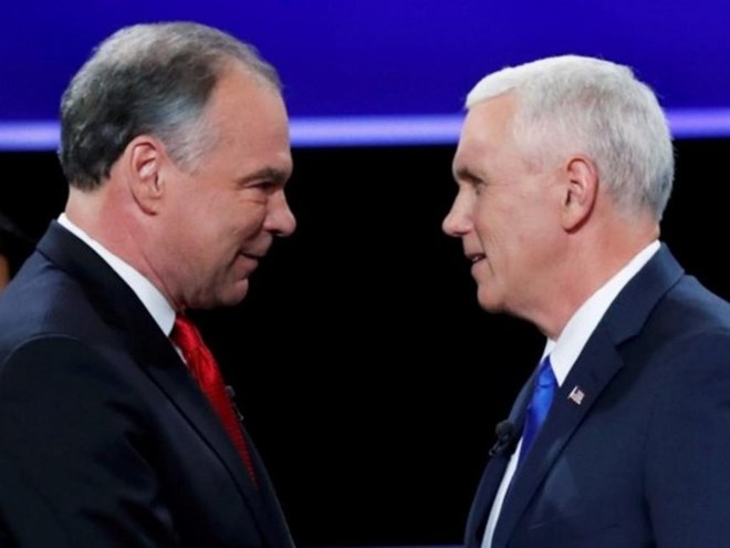 US vice presidential nominees Senator Tim Kaine (L, Democratic) and Governor Mike Pence (Republican) during their vice presidential debate at Longwood University in Farmville, Virginia, US, October 4, 2016/ REUTERS