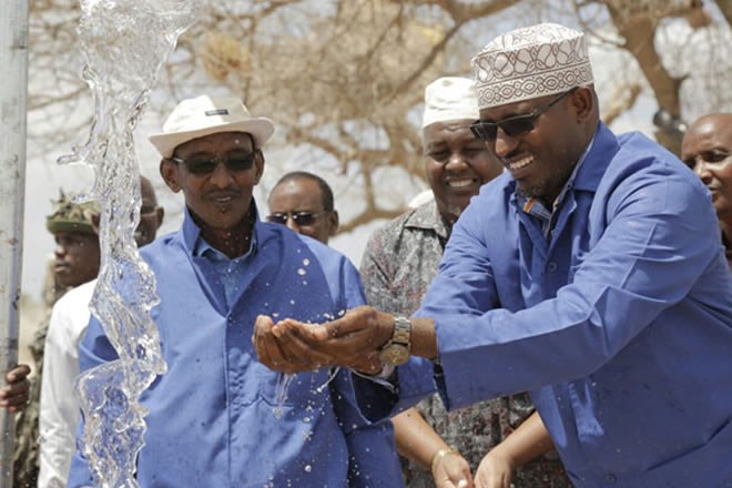 Wajir Governor Ahmed Abdullahi (right) with water chief officer Abdinoor Hussein in Dadajabula in the county on October 13, 2016. Mr Abdullahi asked the national government to use contingency funds to help drought-hit counties. PHOTO |BRUHAN MAKONG | NATION MEDIA GROUP