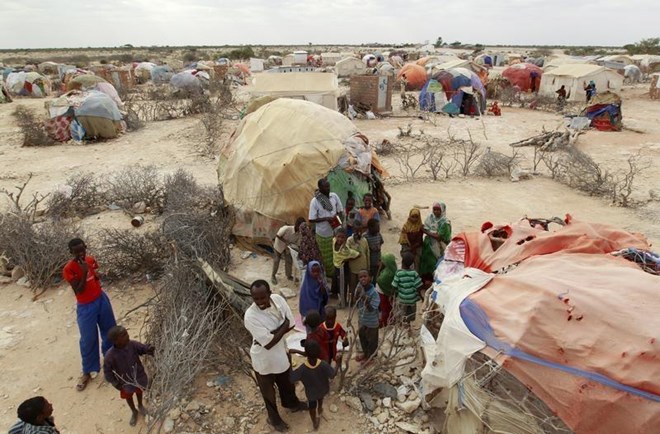 Internally displaced Somalis stand outside a makeshift Muslim Madrasa (Islamic school) at the Halabokhad IDP settlement in Galkayo, northwest of Somalia's capital Mogadishu, July 20, 2011. REUTERS