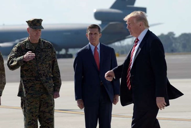 © The Associated Press FILE- In this Monday, Feb. 6, 2017, file photo, President Donald Trump passes Joint Chiefs Chairman Gen. Joseph Dunford, left, and National Security Adviser Michael Flynn as he arrives via Air Force One