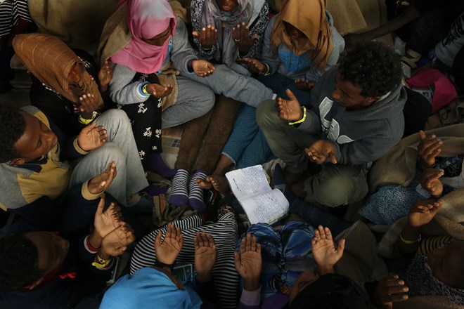 Migrants gather in a circle to sing and pray during the journey to Sicily. About 300 of the 412 rescued migrants were from Eritrea, where Christians and Muslims make up the majority of the population.