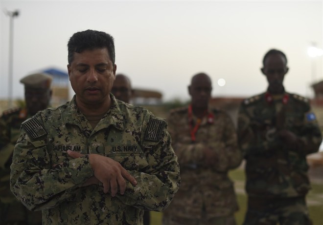 After Ali Dirir gave the cue to begin, U.S. Navy Cmdr. Abuhena Saifulislam, U.S. Africa Command deputy command chaplain, led six other Somali National Army guests to a designated area in which they would pray before partaking in the Iftar feast.