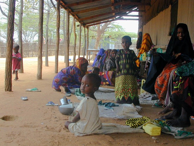 Somali mothers sit outside a feeding center with their