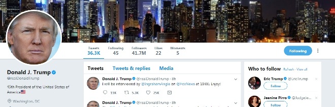 Trump has 41.7 million followers on Twitter and has made extensive use of it to send messages attacking his opponents and promoting his policies, both during the 2016 presidential campaign and since taking office in January.
