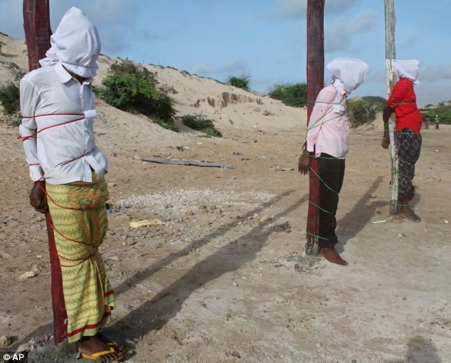 Punishment: Three men found guilty of involvement in an Al-Shabab attack on the Somali Presidential Palace are tied to poles ahead of their execution by firing squad in Mogadishu. FILE PHOTO: AP