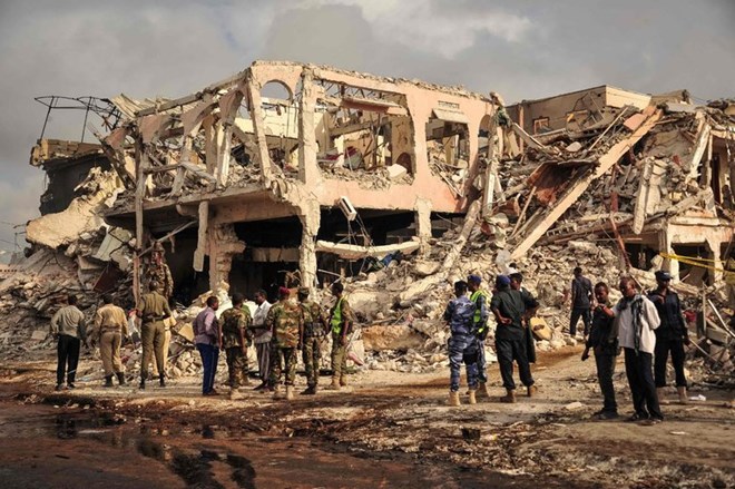 Somali security forces at the scene of the double truck bombings in Mogadishu, the capital, which killed at least 270 people on Saturday. Credit Mohamed Abdiwahab/Agence France-Presse — Getty Images