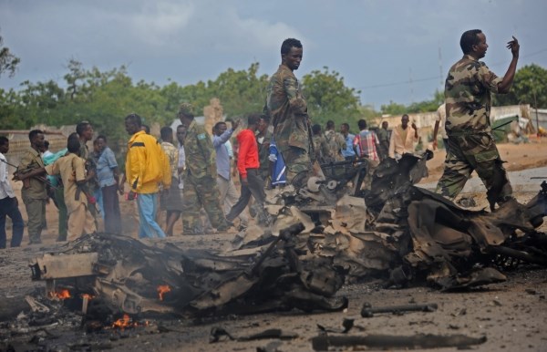 Soldiers patrol around the wreckage of a suicide car bomber that smashed into pickup truck carrying security officers in Mogadishu Photo - AFP