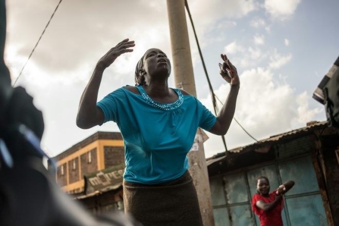 A woman cries out against police violence during election violence in Kawangware, outside Nairobi, on October 27, 2017 © AFP / Fredrik LERNERYD