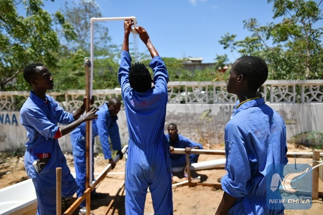 Trainees, many of whom were former child soldiers or affected by armed groups, test the shower head they installed during a class at the training centre ELMAN, a non-government organization (NGO) which cooperates with the United Nations Children's Fund (UNICEF), in Mogadishu, Somalia, March 22, 2017. (Xinhua/Sun Ruibo)