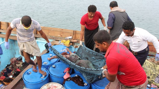 FILE - People carry the body of a Somali refugee, killed in attack by a helicopter while traveling in a vessel off Yemen, at the Red Sea port of Hodeidah, Yemen, March 17, 2017.