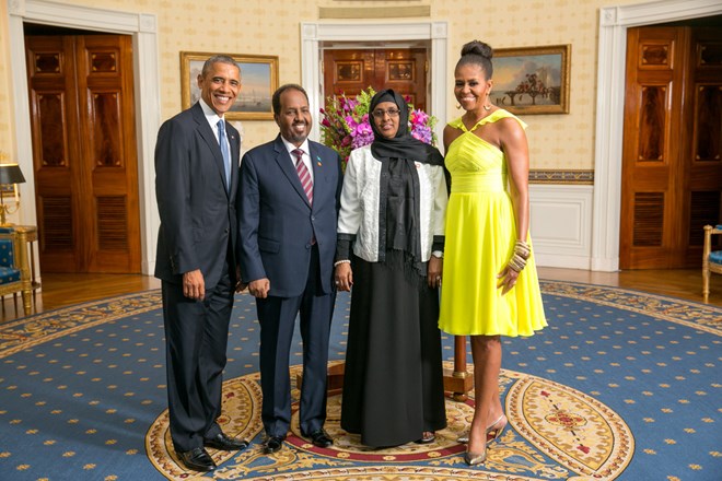President Barack Obama and First Lady Michelle Obama greet His Excellency Hassan Sheikh Mohamud, President of the Federal Republic of Somalia, and Mrs. Qamar Ali Omar, in the Blue Room during a U.S.-Africa Leaders Summit dinner at the White House, Aug. 5, 2014. [Official White House Photo by Amanda Lucidon]