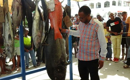 Lamu fishermen display their catches during the county's 4th edition of the fishing competition in November 2017. They want fishers from Somalia and Tanzania barred from selling their catches in Kenya. PHOTO | KALUME KAZUNGU | NATION MEDIA GROUP