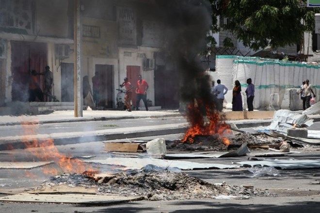 Fires are seen on a street following protest against the shooting by security forces of a rickshaw driver and his passenger, on April 13, 2019 in Mogadishu. Somali security forces shot dead a rickshaw driver and his passenger in the capital on Saturday and killed another four people who were protesting against the shootings, witnesses and lawmakers said (AFP Photo/Abdirazak Hussein FARAH)