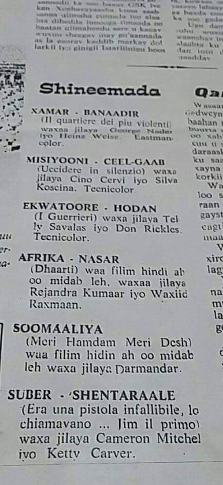 Newspaper listing showing Bollywood films on show in Mogadishu.