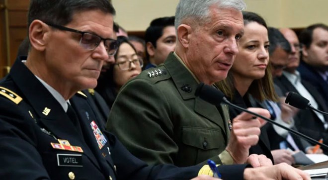U.S. Africa Command Commander Gen. Thomas Waldhauser, center, flanked by U.S. Central Command Commander Gen. Joseph Votel, left, and Acting Assistant Secretary of Defense for International Security Affairs Kathryn Wheelbarger, right, testifies before the House Armed Services Committee on Capitol Hill in Washington, Thursday, March 7, 2019. (AP Photo/Susan Walsh) –The Associated Press