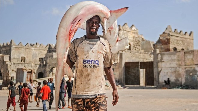 A Somali fisherman carries a hammerhead shark on his head to the Hamarweyne fish market near the port in Mogadishu, Somalia, on January, 5, 2018. (Mohamed Abdiwahab/AFP / Getty Images)