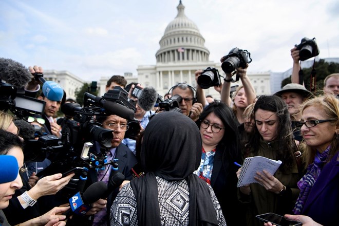 Rep. Ilhan Omar speaks to reporters during a youth climate rally at the U.S. Capitol on March 15, 2019. Photo: Brendan Smialowski/AFP/Getty Images