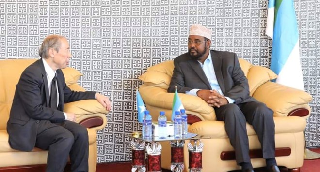 US Ambassador Donald Yamamoto [L] and Jubaland president Ahmed Madobe [R] having talks in Kismayo city