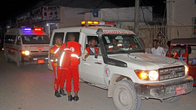 Medical workers wait by ambulances ready to transport wounded, after a bomb attack at an ice cream shop in Mogadishu, Somalia, Nov. 27, 2020