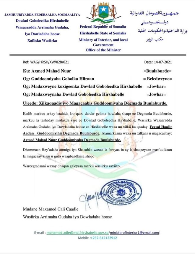 Beledweyne (HOL) - The office of the Minister of Interior has fired the district commissioner of Bula Burte Feisal Hajir Aden.