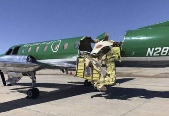 The pilot was the only person aboard a twin-engine Fairchild Metroliner that landed at Centennial Airport despite suffering major damage to its tail section. The plane is owned by a Colorado-based company called Key Lime Air that operates cargo aircraft.