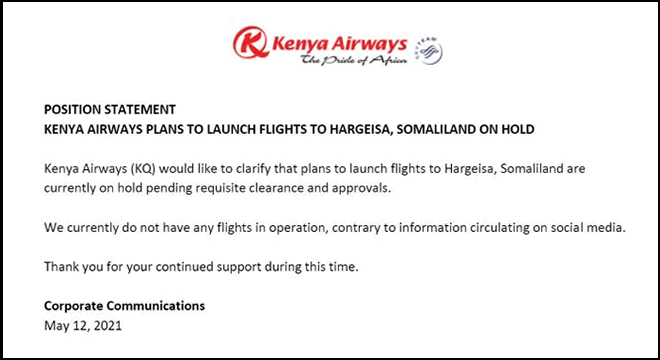 Kenya Airways (KQ) has Wednesday announced plans to halt the launch of flights to Hargeisa, Somaliland.