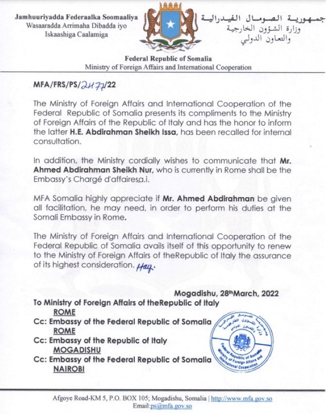 Italy's Ministry of Foreign Affairs and International Cooperation issued a memo on April 6 - which HOL has seen - affirming Somalia's decision to recall the ambassador and said that it would be issuing the necessary identification to Ahmed Abdirahman Sheikh Nur.