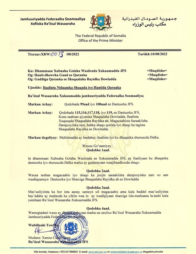 Mogadishu (HOL) - Somali Prime Minister, Hamza Abdi Barre, forbade his new cabinet members from removing or transferring officials from their positions outside the framework laid out in the constitution and the nation’s labour law.