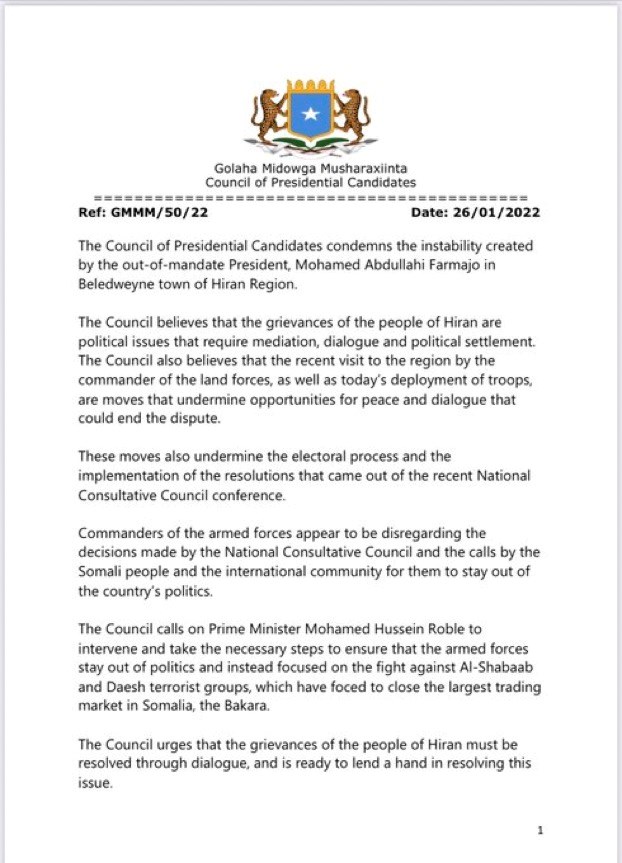 The statement singles out President Farmajo for manufacturing the latest escalation in Beledweyne“The council of presidential candidates condemns the instability created by the out-of-mandate President, Mohamed Abdullahi Farmajo.”