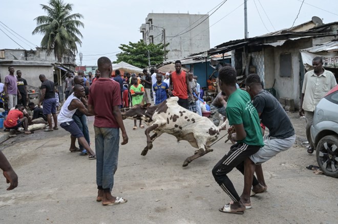 Young Muslim men prepare to slaughter an ox after Eid al-Adha prayers in Adjame, a district of Abidjan, Ivory Coast. [Sia Kambou/AFP]