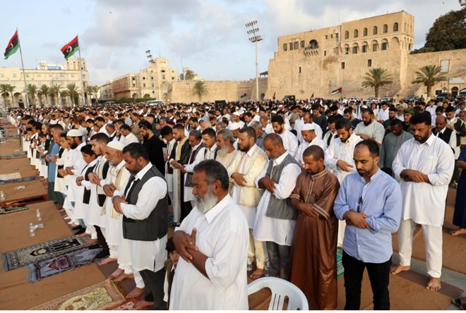 Muslims perform the morning prayer in the Libyan capital, Tripoli, on the Eid el-Adha holiday. [Mahmud Turkia/AFP]