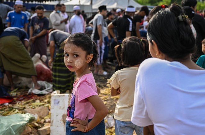 A Rohingya refugee girl living in Malaysia looks on as people slaughter a cow during the Eid al-Adha festival in Kuala Lumpur. [Mohd Rasfan/AFP]