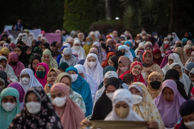 Filipino Muslims gather outside the Blue Mosque after the morning prayer on Eid al-Adha, in Taguig City, Metro Manila. [Lisa Marie David/Reuters]