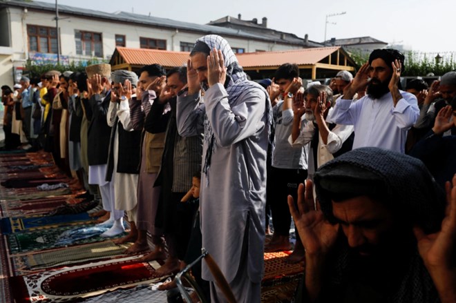 Afghan people pray on the first day of Eid al-Adha, in Kabul. [Ali Khara/Reuters]