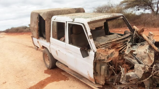 WAR ON TERROR: Wreckage of the vehicle that ran over an IED in Dadach Qatarow between Ires Kinto and Domog along Wargadud- Takaba Road, Mandera county, on Thursday, July 14.