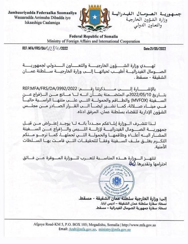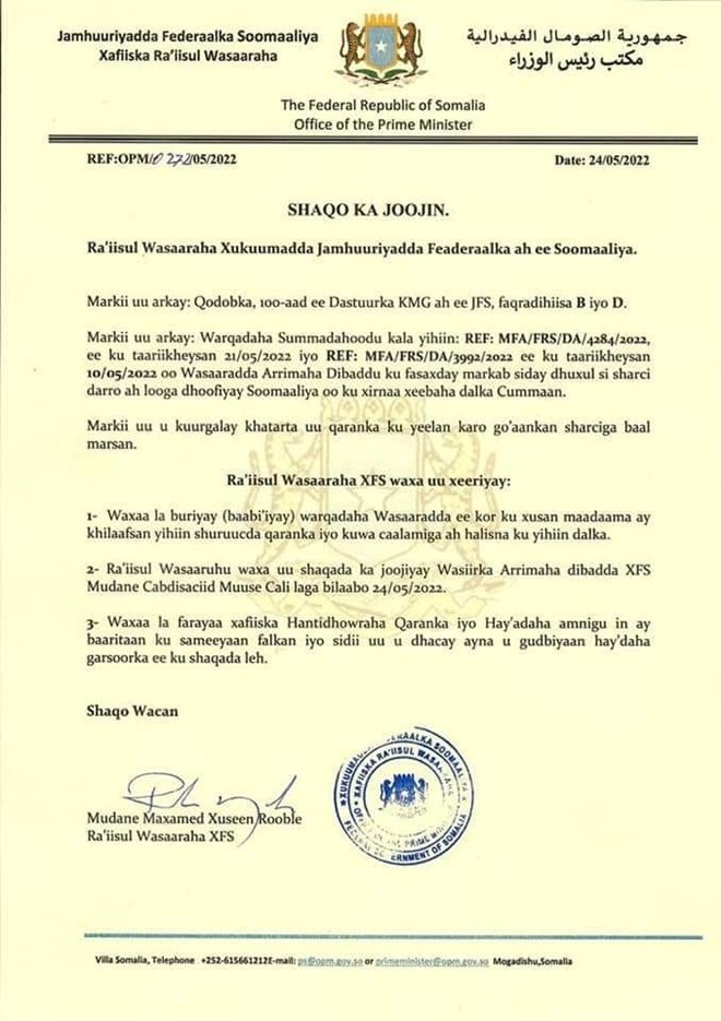 In a statement from the Office of the Prime Minister, Roble said that the letter from the ministry violates national and international law and poses a threat to the country.