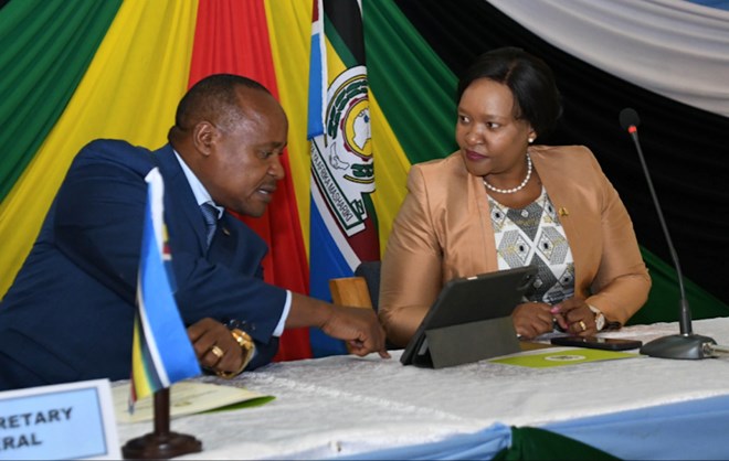 EAC secretary general Peter Mathuki with Kenya’s EAC, Arid and Semi-Arid Lands and Regional Development CS Rebecca Miano during commencement of negotiations between EAC and Somalia, in Nairobi, on August 22 /EAC