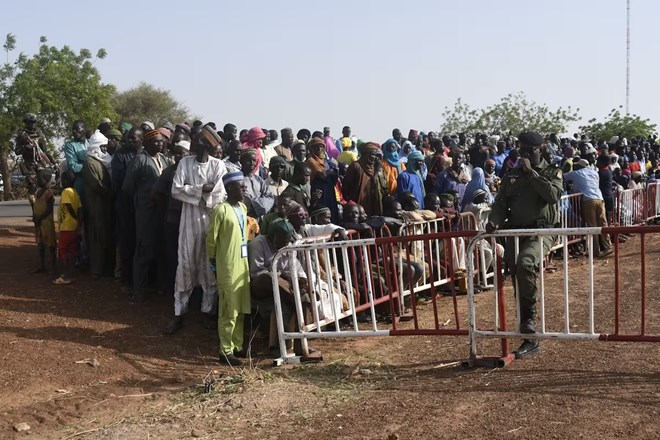 People displaced due to jihadist violence attend a meeting in Makalondi, southwestern Niger, in June 2022. (Boureima Hama/AFP/Getty Images)