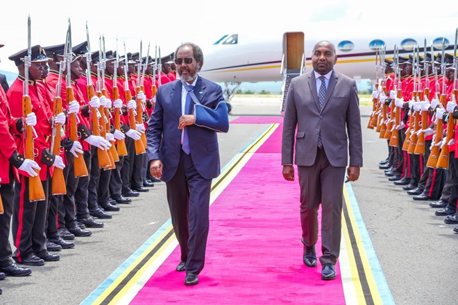 Somalia's President, Hassan Sheikh Mohamud (Left) arrival to Arusha, Tanzania for 23rd EAC heads of state Summit. Image: Courtesy