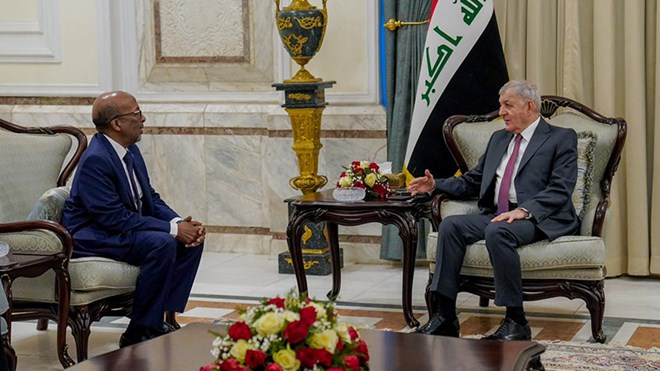 Abdul-Latif Rashid (right), the President of the Republic of Iraq, during his meeting with Liban Sheikh Mahmood, Somali Ambassador to Iraq, Feb. 5, 2023. (Photo: Iraqi Presidency)