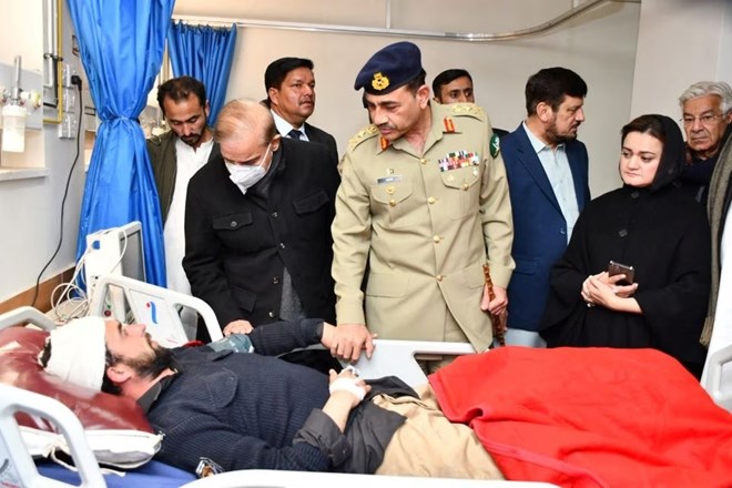 Chief of Army Staff (COAS) of Pakistan Asim Munir and Pakistan's Prime Minister Shehbaz Sharif visit an injured, after a suicide blast in a mosque, at a hospital in Peshawar, Pakistan January 30, 2023. Prime Minister's Office/Handout via REUTERS