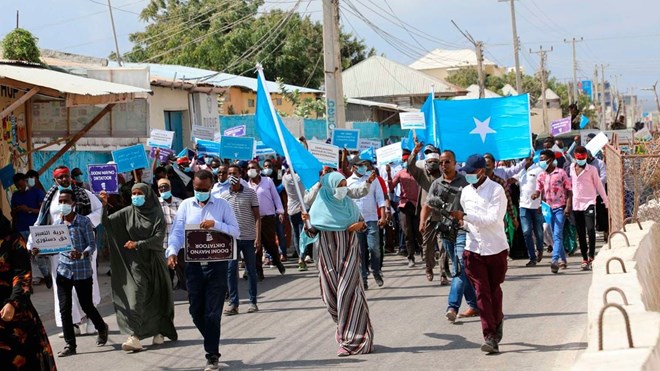 Supporters of different opposition presidential candidates demonstrate in Mogadishu on February 19, 2021. The biggest coalition of parties in Somalia has opposed proposals to change the constitution and extend the government’s term from four to five years. PHOTO | AFP