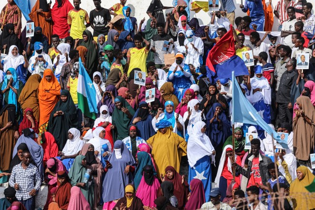 Demonstrators hold flags during a rally against the Al-Shabaab jihadist group in Mogadishu on January 12, 2023. Somalia's President Hassan Sheikh Mohamud has declared "all-out war" against Al-Shabaab, which has been waging a bloody insurgency against the frail internationally-backed federal government for 15 years. (Photo by Hassan Ali Elmi / AFP)