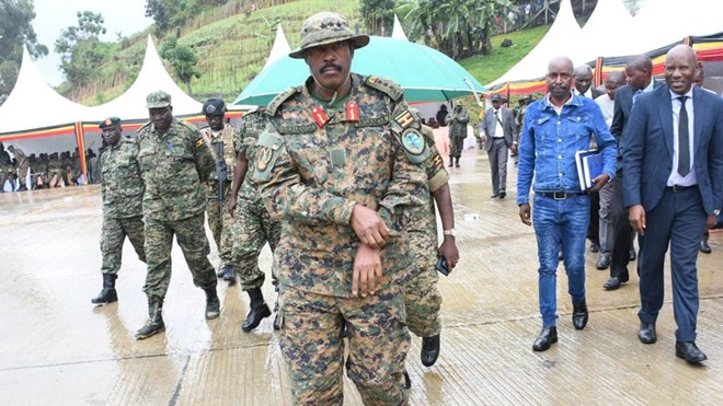 The Commander of Ugndan Land Forces Lt Gen Kayanja Muhanga on March 29, 2023 arrives at the Bunagana border to flag off UPDF troops going to DR Congo peace mission. PHOTO | MONITOR