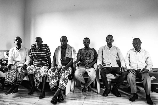 From left to right: Shilow Muse Ali, the father of 4-year-old Mariam Shilow Muse and husband of 22-year-old Luul Dahir Mohamed, both of whom were killed in a U.S. drone strike in 2018; Luul’s father and Mariam’s grandfather, Dahir Mohamed Abdi; and Luul’s brothers and Mariam’s uncles Qasim Dahir Mohamed, Ahmed Dahir Mohamed, Hussein Dahir Mohamed, and Abdi Dahir Mohamed, in Mogadishu, Somalia, on May 10, 2023. Photo: Omar Abdisalan for The Intercept