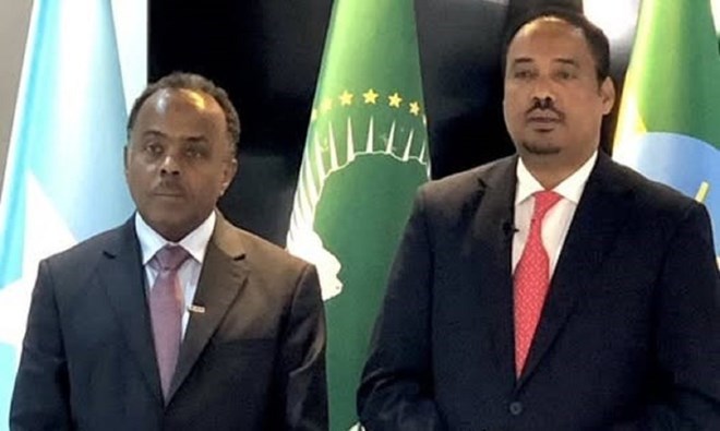 FILE - Somalia’s State Minister for Foreign Affairs, Ali Mohamed Omar (left), and Ethiopia’s State Minister for Foreign Affairs, Ambassador Misganu Arga (right), pose together during high-level talks in Addis Ababa aimed at advancing agreements reached during the Ankara Summit. The meeting focused on strengthening bilateral ties and addressing key regional issues.