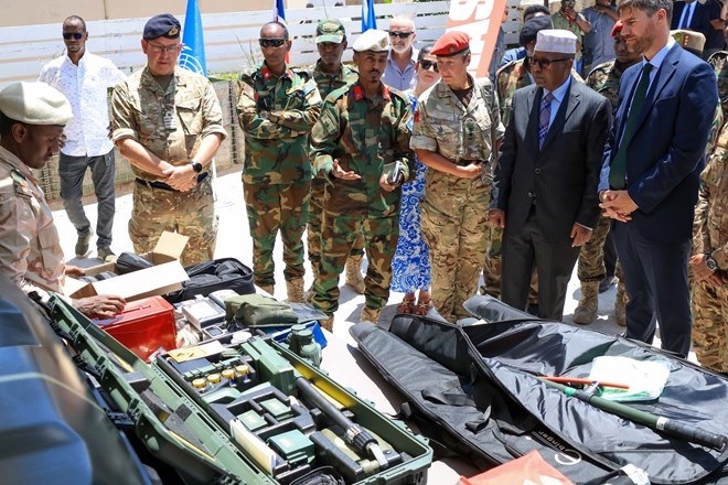 Mogadishu (HOL) — Somalia’s federal government on Thursday received advanced vehicles and equipment from the United Kingdom designed to help the Somali National Army counter explosive devices.